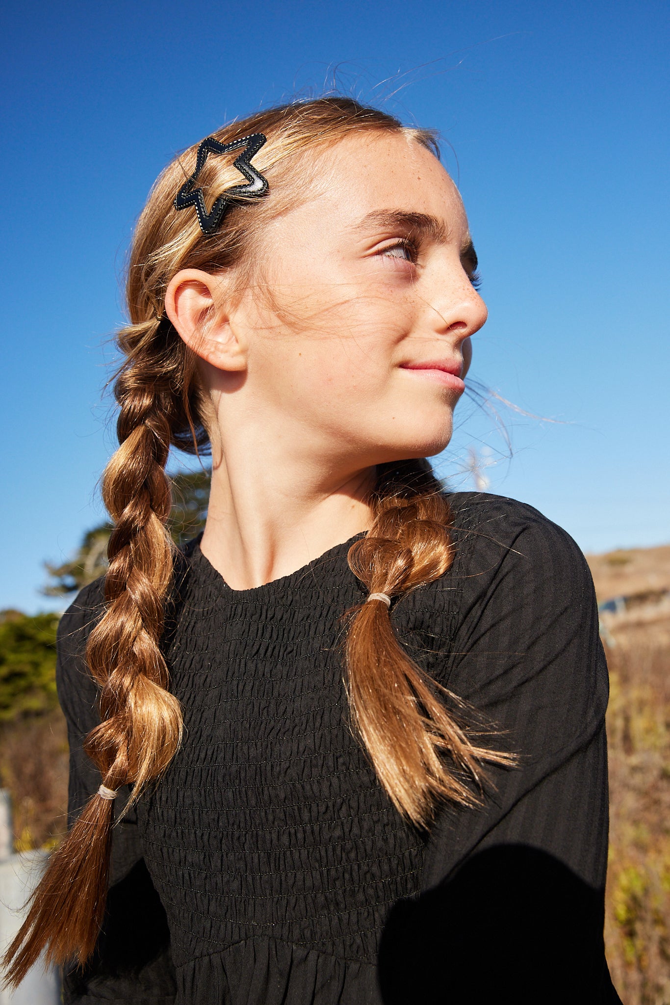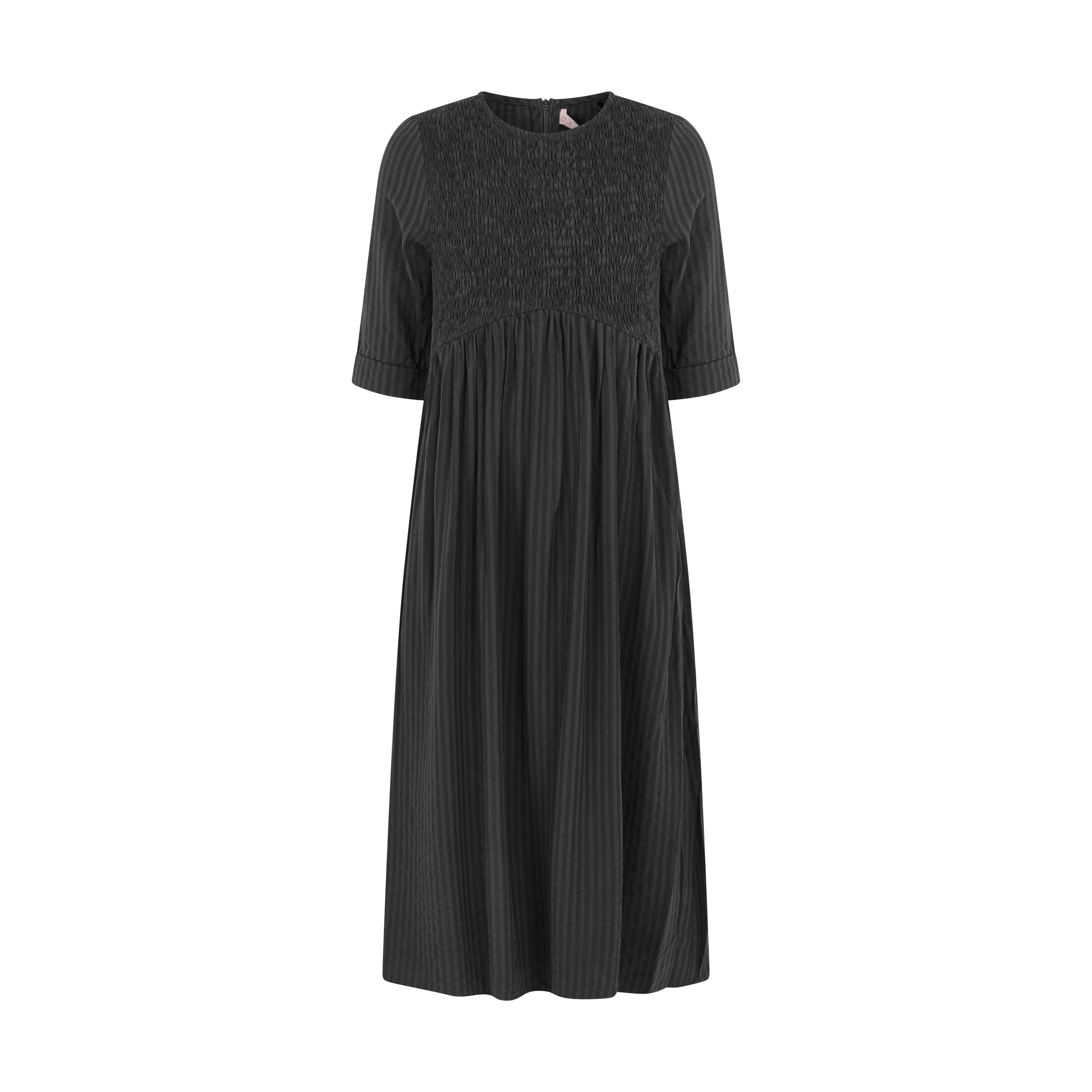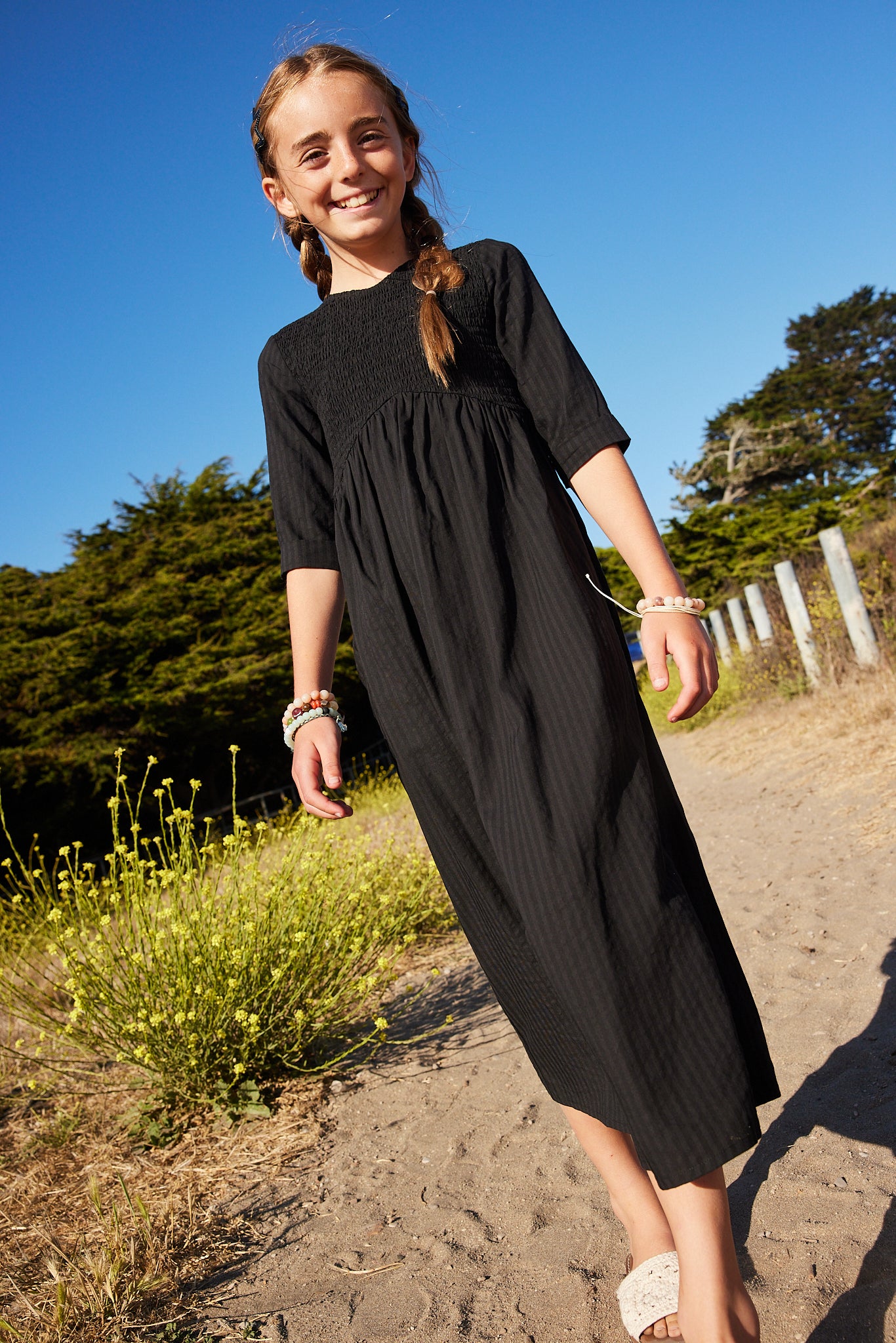 This beautifully flowy smocked black maxi is a charming, vacation-ready piece from our new summer collection. Featuring subtle tone-on-tone striping and delicate smocked detailing, it strikes the perfect balance between playful ease and refined sophistication.